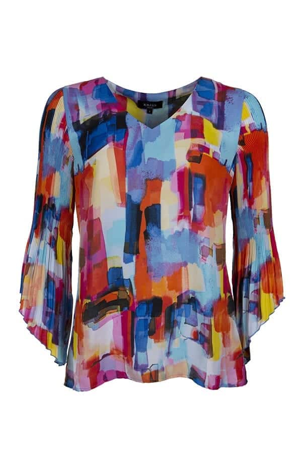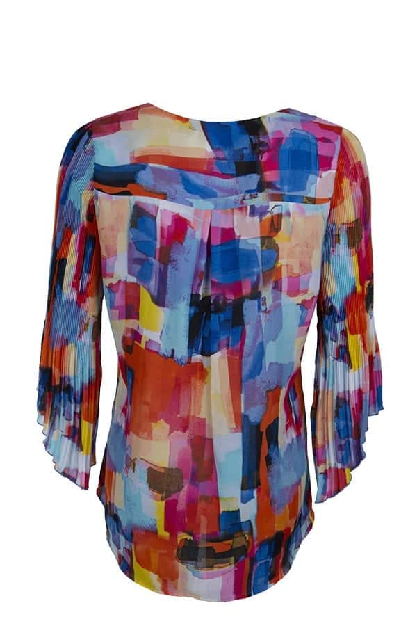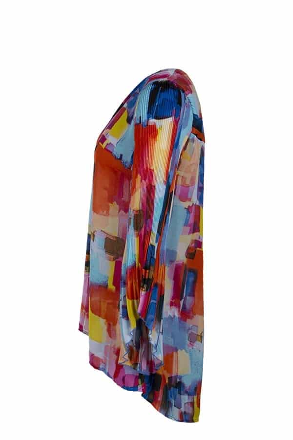 Generös blus med ett tufft och färgstarkt print i multifärg. V-ringad hals med svart kantband och plisserad överärm som sedan släpper i plisseringen och avslutas i en assymetrisk linje. Det kortare framstycket är 50 cm långt från högsta punkten och det längre bakstycket är 71 cm långt i storlek S.