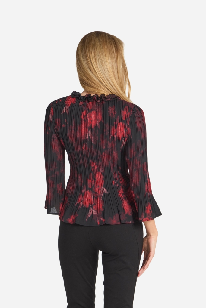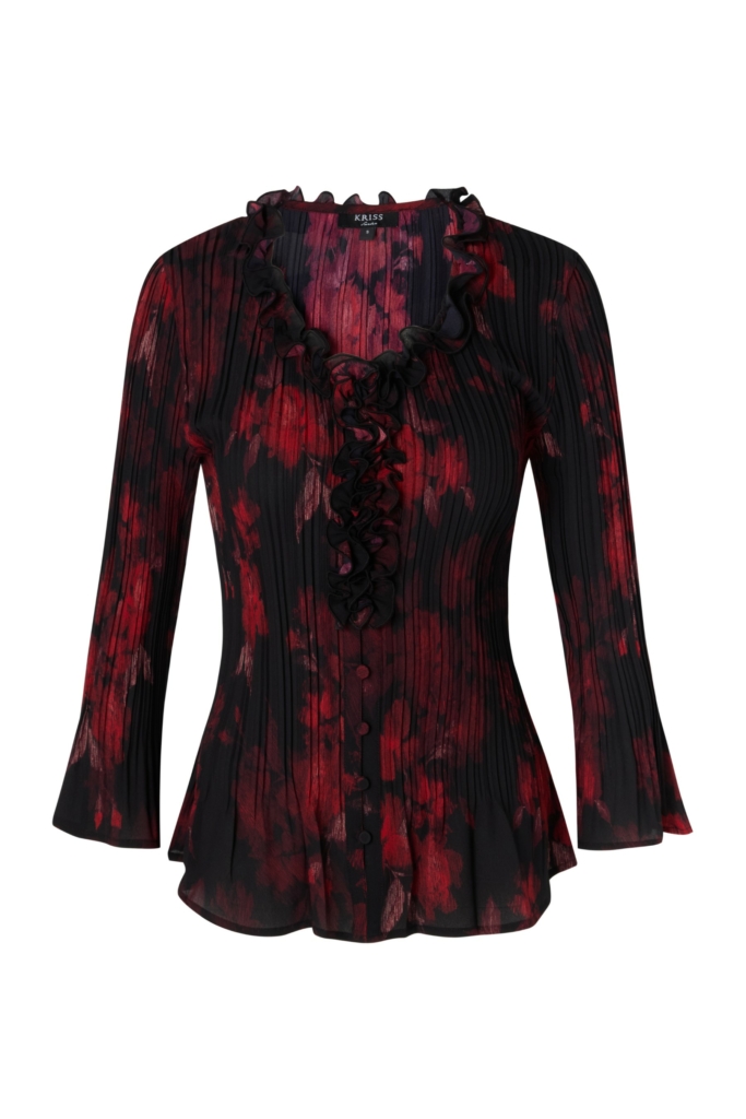 Plisserad blus i ett höstligt print på svart botten. Utstruken kant i ärmslutet samt vid blusens nederkant vilket gör att blusen faller snyggt runt stussen. Ärmen är 3/4-lång och den V-formade halsringningen pryds av små frill/volanger i printet, vilka även fortsätter en bit ned över bysten. Stängning med klädda knappar och knappöglor. Den totala längden i storlek S är 62 cm från den högsta punkten. Modellen på bilden är 178 cm lång.