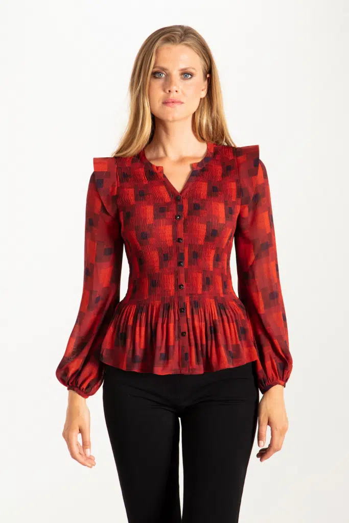 Söt blus i återvunnen polyester med rutor i printet. Tät plissering i livet som makerar midjan för att sedan släppa runt stuss och höft. Blusen har en ståkrage samt knäppkant med dekorativa knappar mitt fram. Den har små vingar på axeln och långa vida ärmar som avslutas med ett kantband nertill. Den totala längden i storlek S är 62 cm från den högsta punkten under kragen.