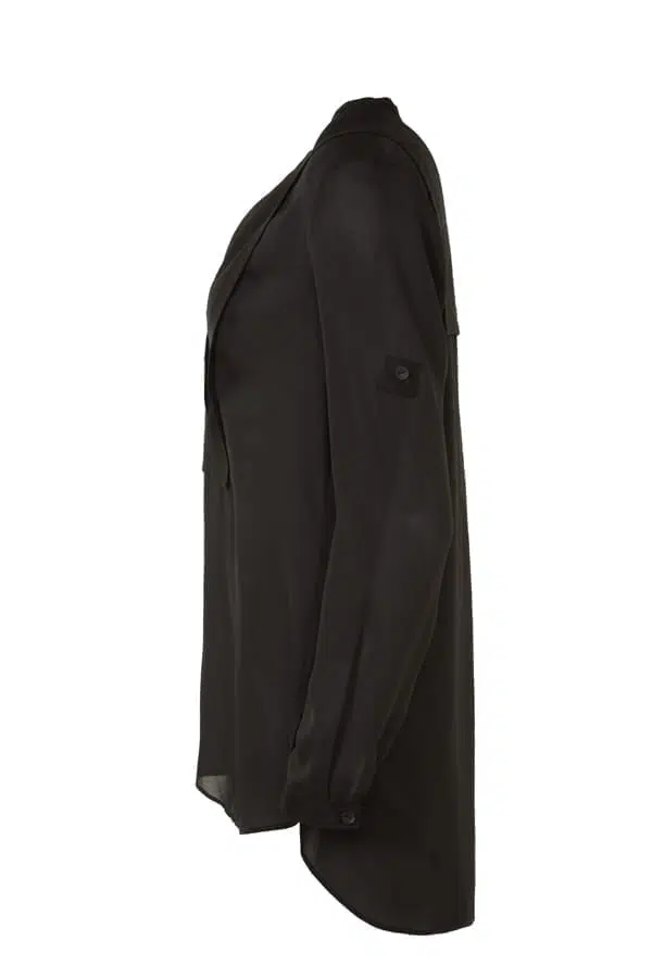Perfekta basblusen att bära under den skräddade jackan. Blusen är i chiffong med detaljer i linne över kragen och v-ringningen som även går ner en bit framtill och baktill. Lång ärm med manschett. Ärmen går av vikas upp och fästas med en slejf. Blusen är rundad nedtill och har en något längre rygg.
