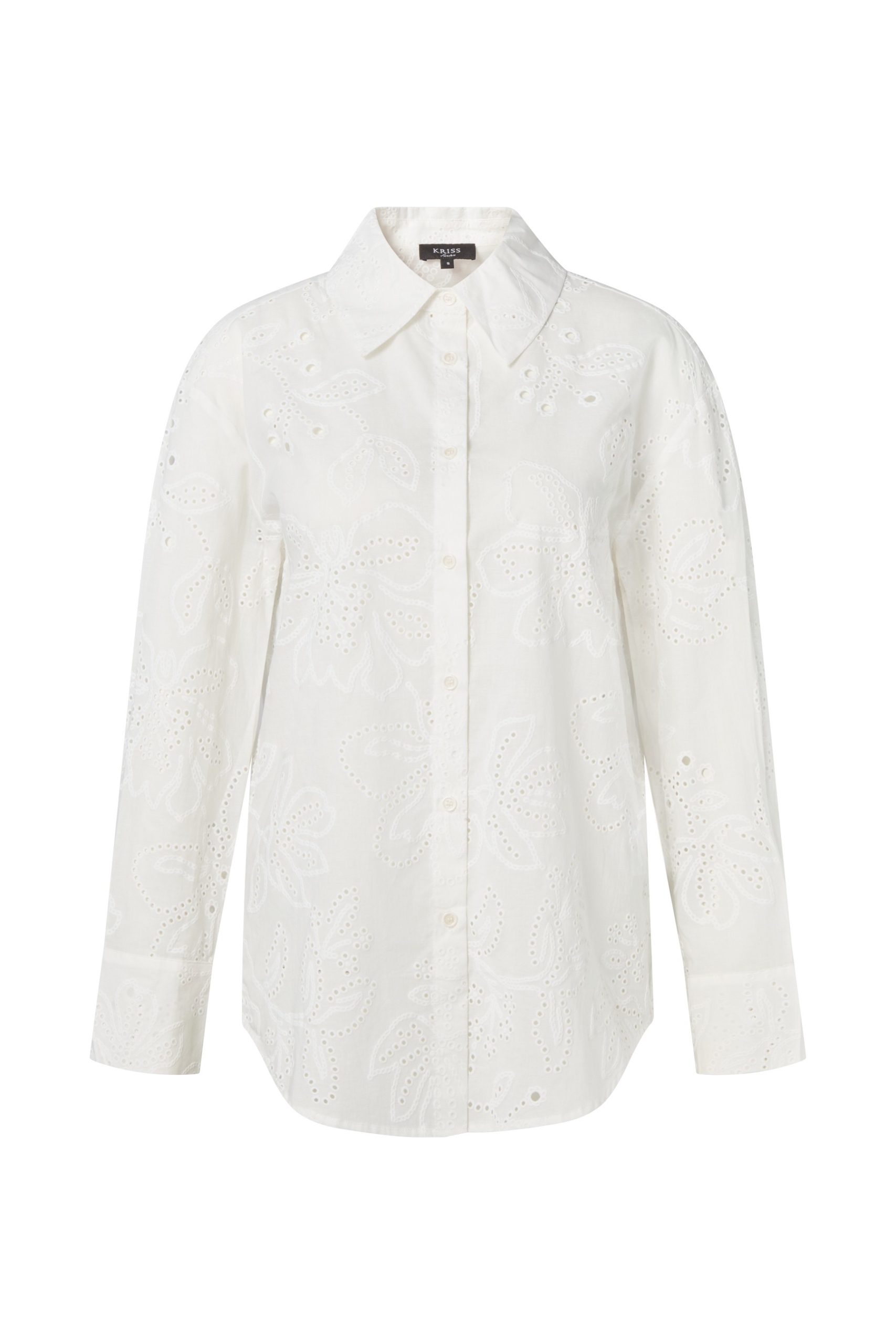 Skir svart blus med prickiga knoppar som ger struktur åt tyget. Livet är fodrat med svart foder men den vida ärmen är skir och pryds dessutom av en vacker genombruten spets. Rund halsringning som rynkats med ett gummiband och fusk-knytband med tofsar. Mycket lättburen och generös modell både till vardags och fest.