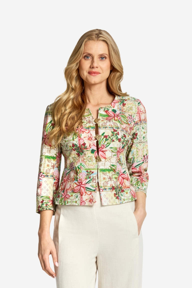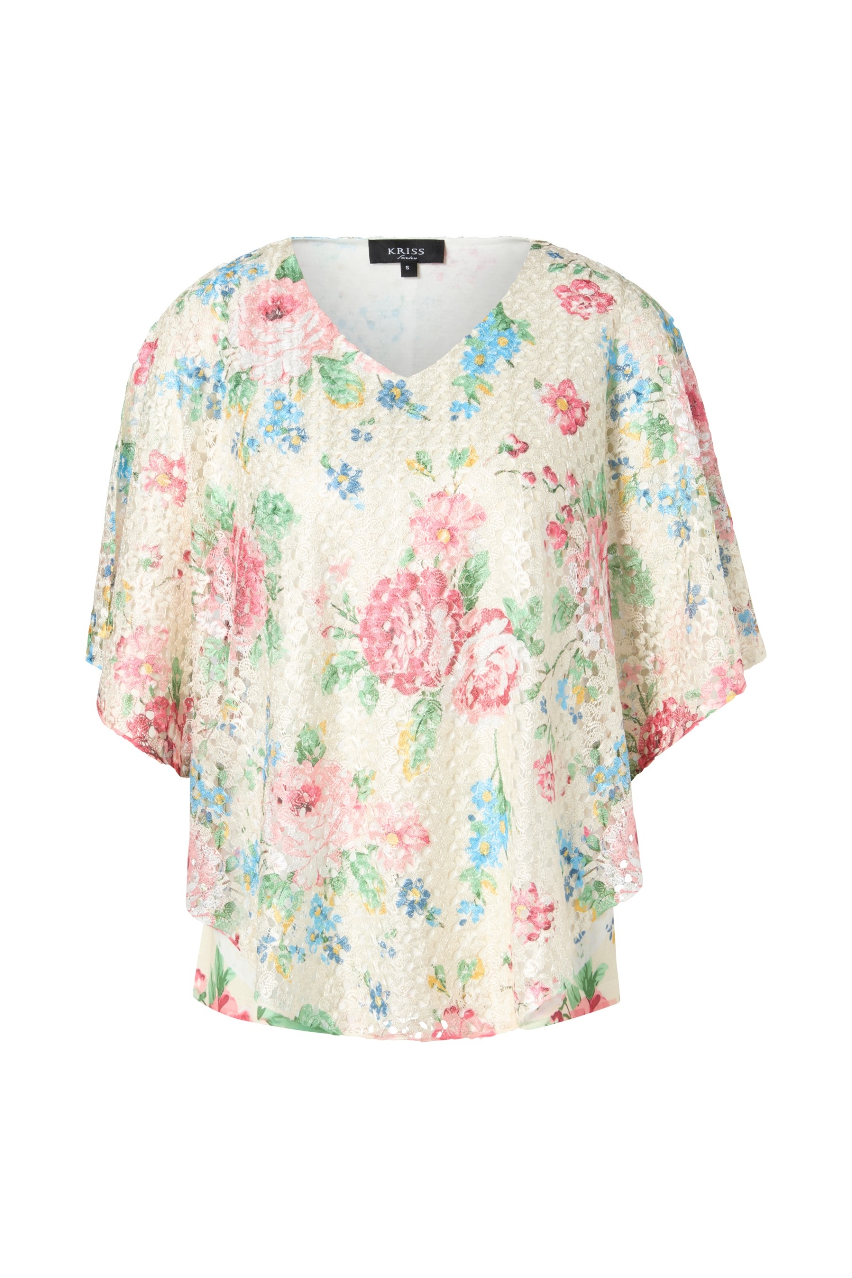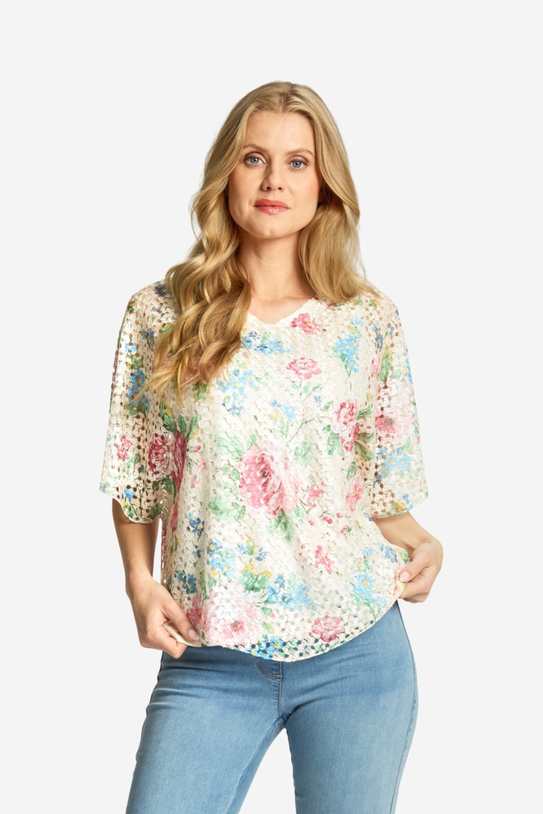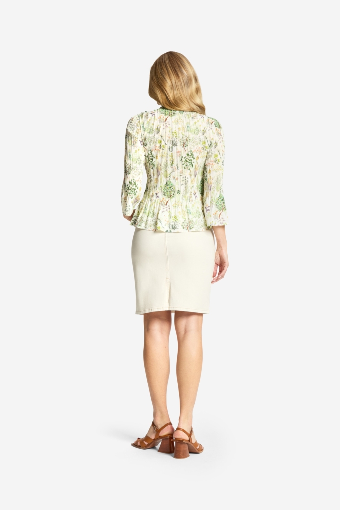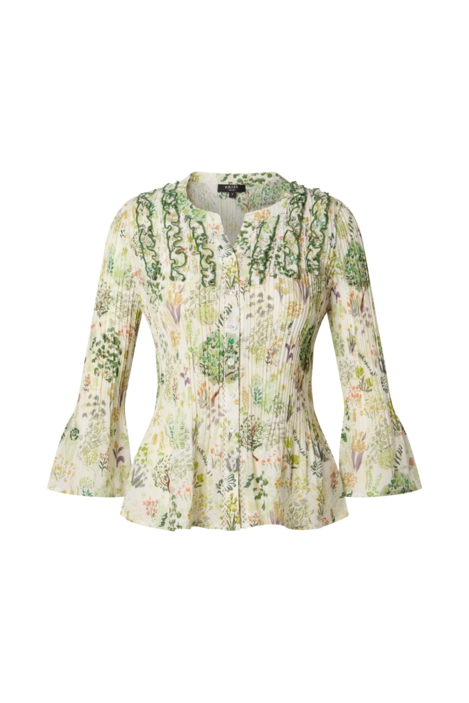 Blommig blus med lätt plissering och utstruket avslut nedtill. Påsydda volanger med laskade kanter från axeln och ner längs med V-ringningen. Mellan volangerna och längs med knappslån finns infällda spetsbårder. Blusen har en liten ståkrage, 3/4 lång ärm med utstruken nederkant och små knappar framtill. Längden i storlek S är 61 cm från den högsta punkten under kragen. Modellen på bilden är 178 cm lång och bär storlek small. Våra större storlekar är normala i storleken, medan våra mindre storlekar är något mer generösa.