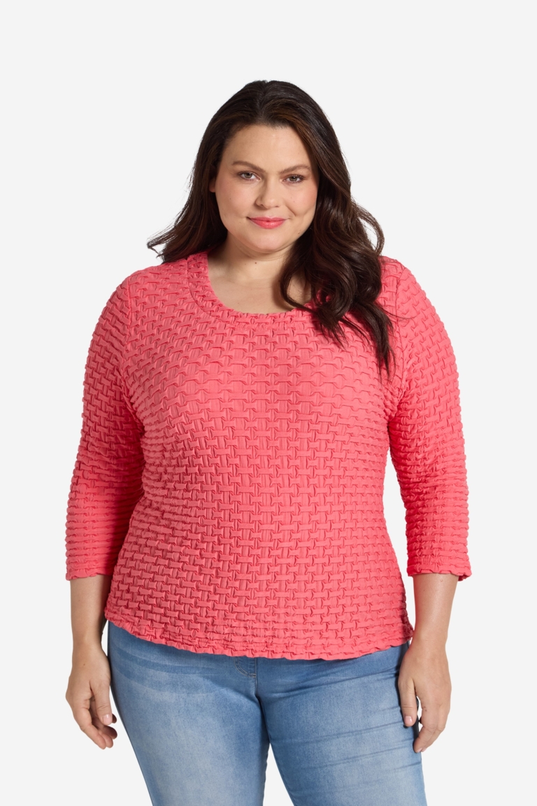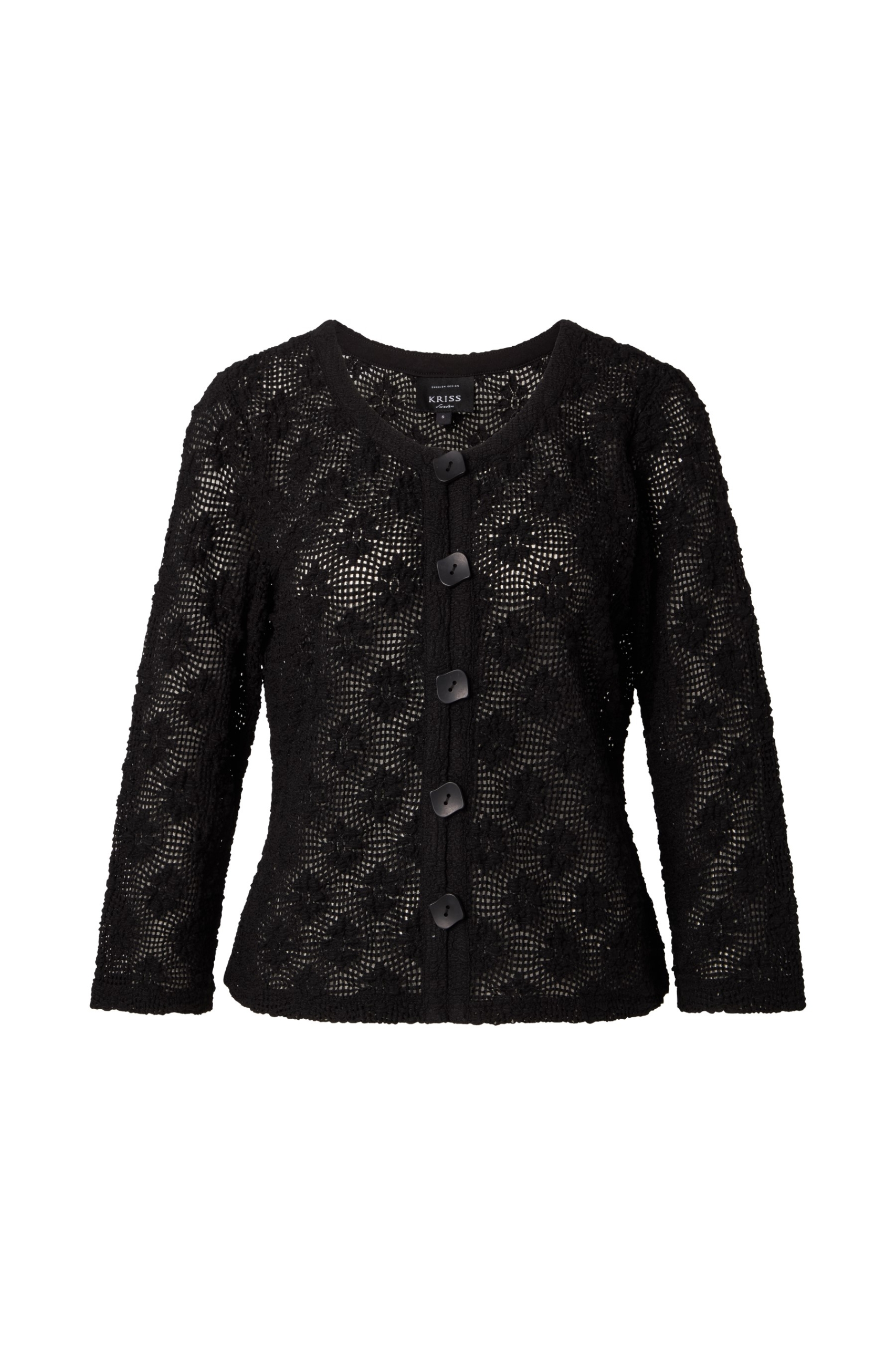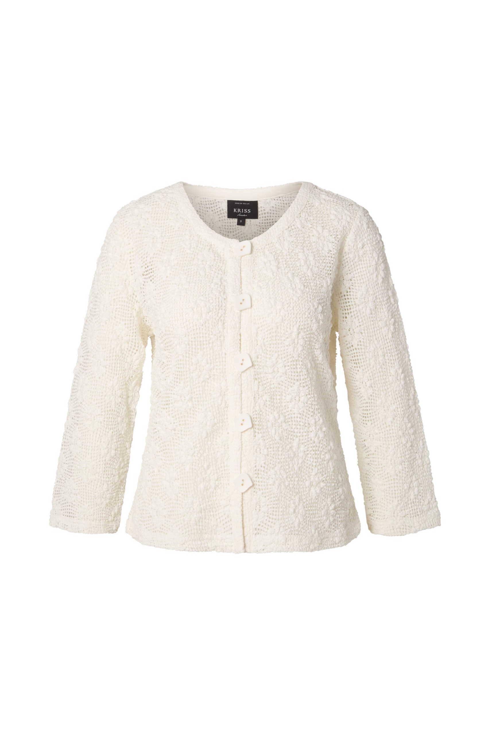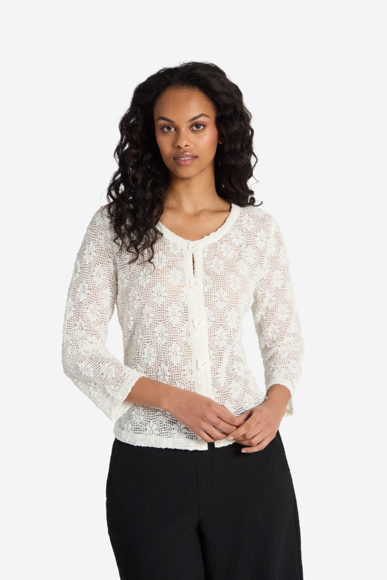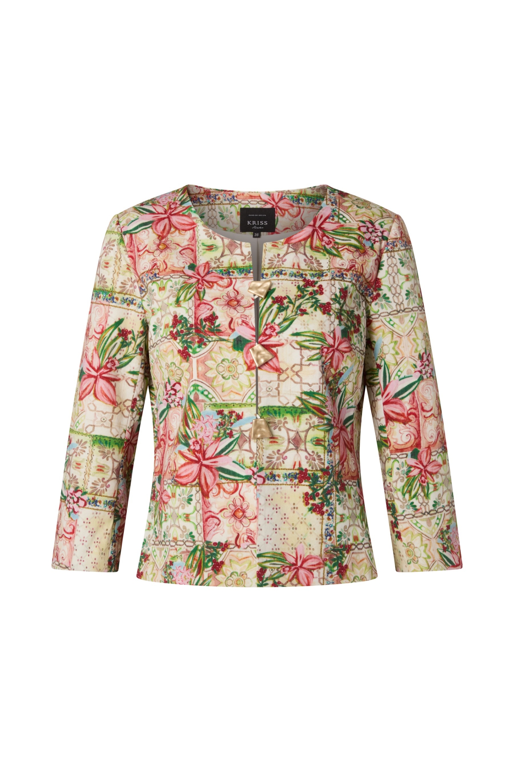 Blommig blus med lätt plissering och utstruket avslut nedtill. Påsydda volanger med laskade kanter från axeln och ner längs med V-ringningen. Mellan volangerna och längs med knappslån finns infällda spetsbårder. Blusen har en liten ståkrage, 3/4 lång ärm med utstruken nederkant och små knappar framtill. Längden i storlek S är 61 cm från den högsta punkten under kragen. Modellen på bilden är 178 cm lång och bär storlek small. Våra större storlekar är normala i storleken, medan våra mindre storlekar är något mer generösa.