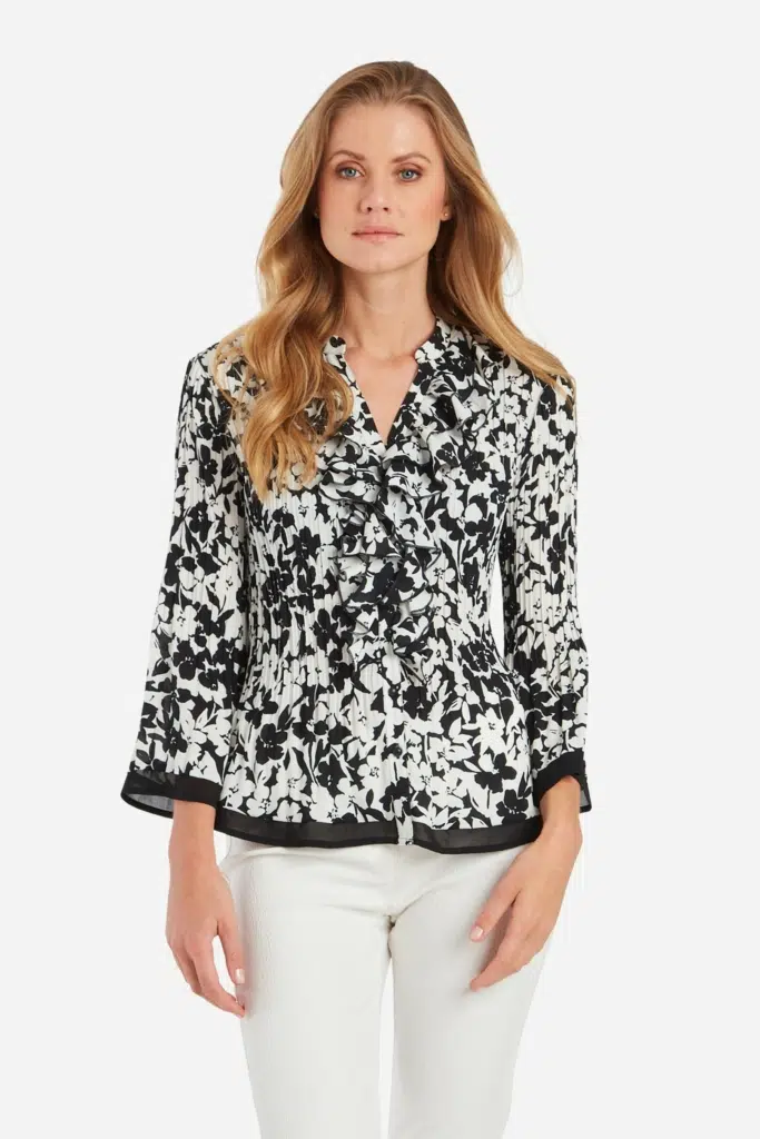 Plisserad blus med ett svart-vitt blomprint och svarta detaljer. Kragstånd vid halsringningen och en V-formad halsringning med generösa volanger runt knäppkanten. Modellen är något insvängd i midjan och släpper i plisseringen både i nederkanten av den 3/4 långa ärmen samt runt höft och stuss. Vid dessa avslut finns även en svart chiffongkant.