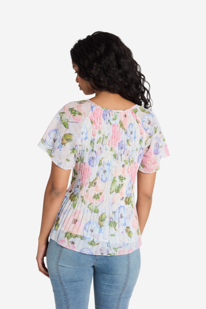 Plisserad blus med blommigt print i återvunnen polyester chiffong. Rund halsringning med V-sprund samt knytband med en metalldetalj i änden. Blusen är utstruken i nederkanten, och har en kort utstruken raglan-ärm. Den totala längden i storlek S är 63 cm från den högsta punkten. Modellen på bilden är 178 cm lång och bär storlek small. Våra större storlekar är normala i storleken, medan våra mindre storlekar är något mer generösa.