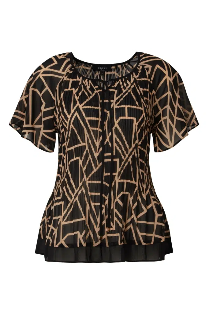 Plisserad blus med tufft print i återvunnen polyester chiffong. Rund halsringning med V-sprund samt knytband med tofs och metalldetalj i guldfärg i änden. Blusen har en svart kant nertill, är utstruken i nederkanten, och har en kort utstruken raglan-ärm. Den totala längden i storlek S är 63 cm från den högsta punkten.