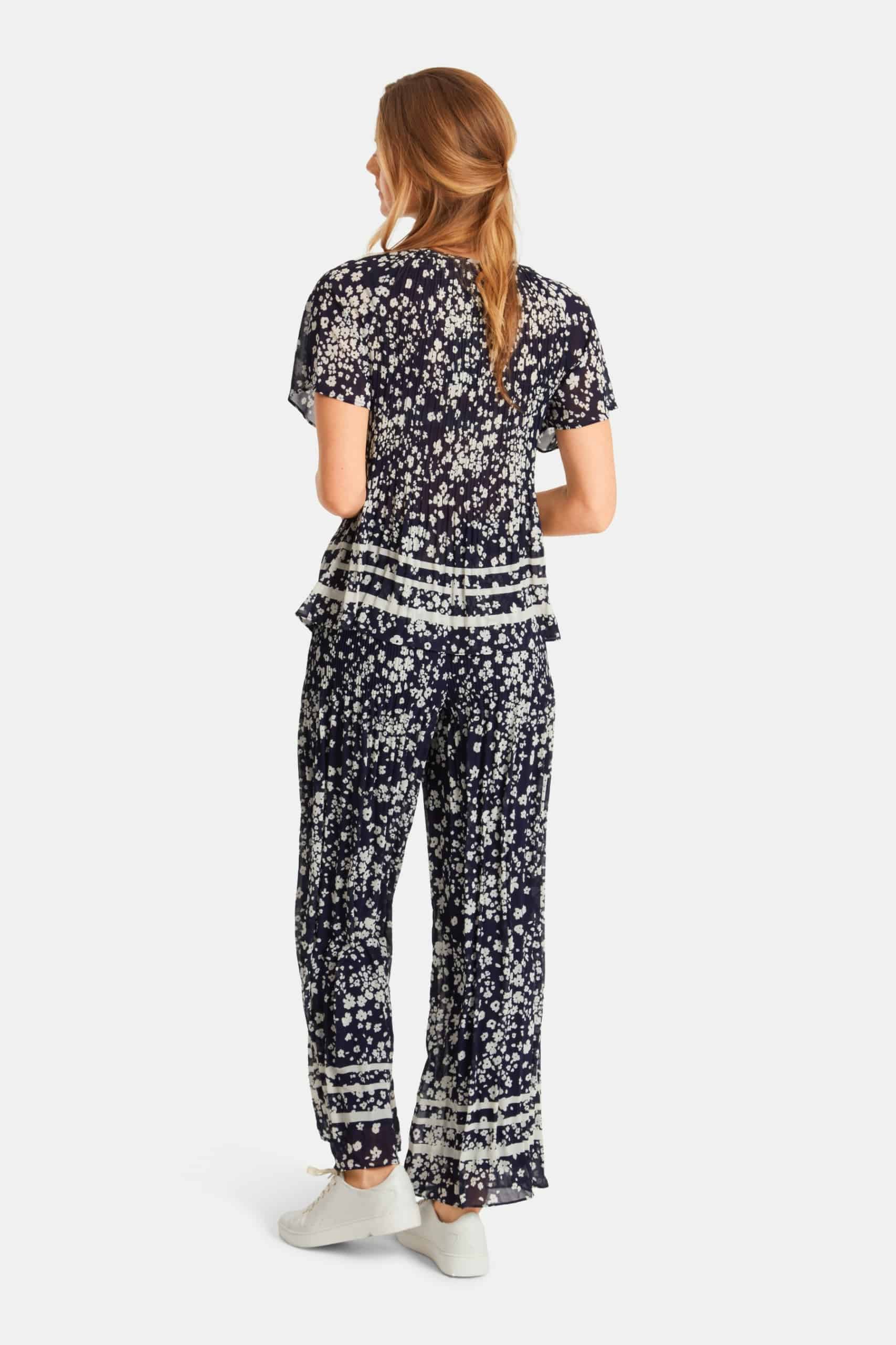 Plisserad blus med småblommigt print i återvunnen polyester chiffong. Rund halsringning med V-sprund samt knytband med tofs och metalldetalj i guldfärg i änden. Blusen har ett bårdprint nertill och är utstruken i nederkanten, och den
