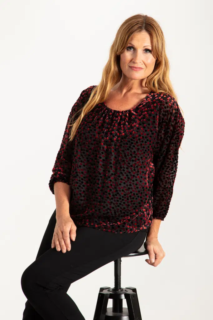 Generös blus med flockprintad sammet med prickar på en svart botten. Rund halsringning med ett rynkat parti i mitten både fram och bak. Rak modell men något rundad nederkant. Blusen är fodrad längs med kroppen och har en 3/4-lång, vid och genombruten ärm med resår nertill. Den totala längden i storlek S är 63 cm från den högsta punkten.