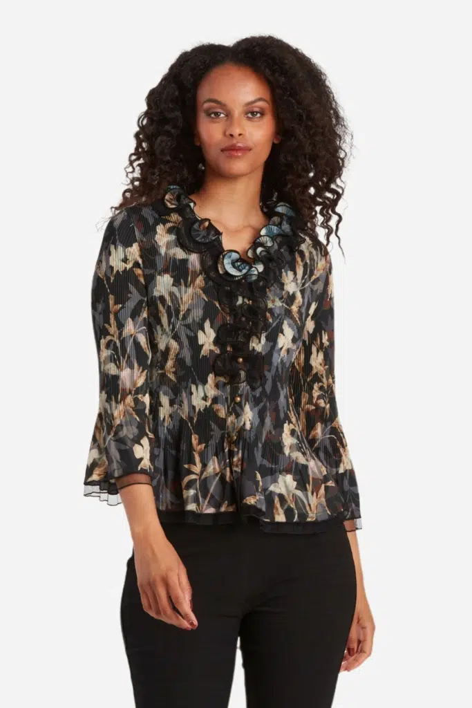 Plisserad blus i chiffongtyg med print samt en svart meshkant i ärmslut och i blusens nederkant. Den V-ringade halsringningen pryds av vackra volanger både i grundprintet och i enfärgad svart mesh. Modellen är något insvängd i midjan och släpper i plisseringen både runt höft, stuss och i nederkanten av den 3/4 långa ärmen. Blusen stängs med små diskreta knappar framtill. Den totala längden i storlek S är 62 cm från den högsta punkten under volangen.