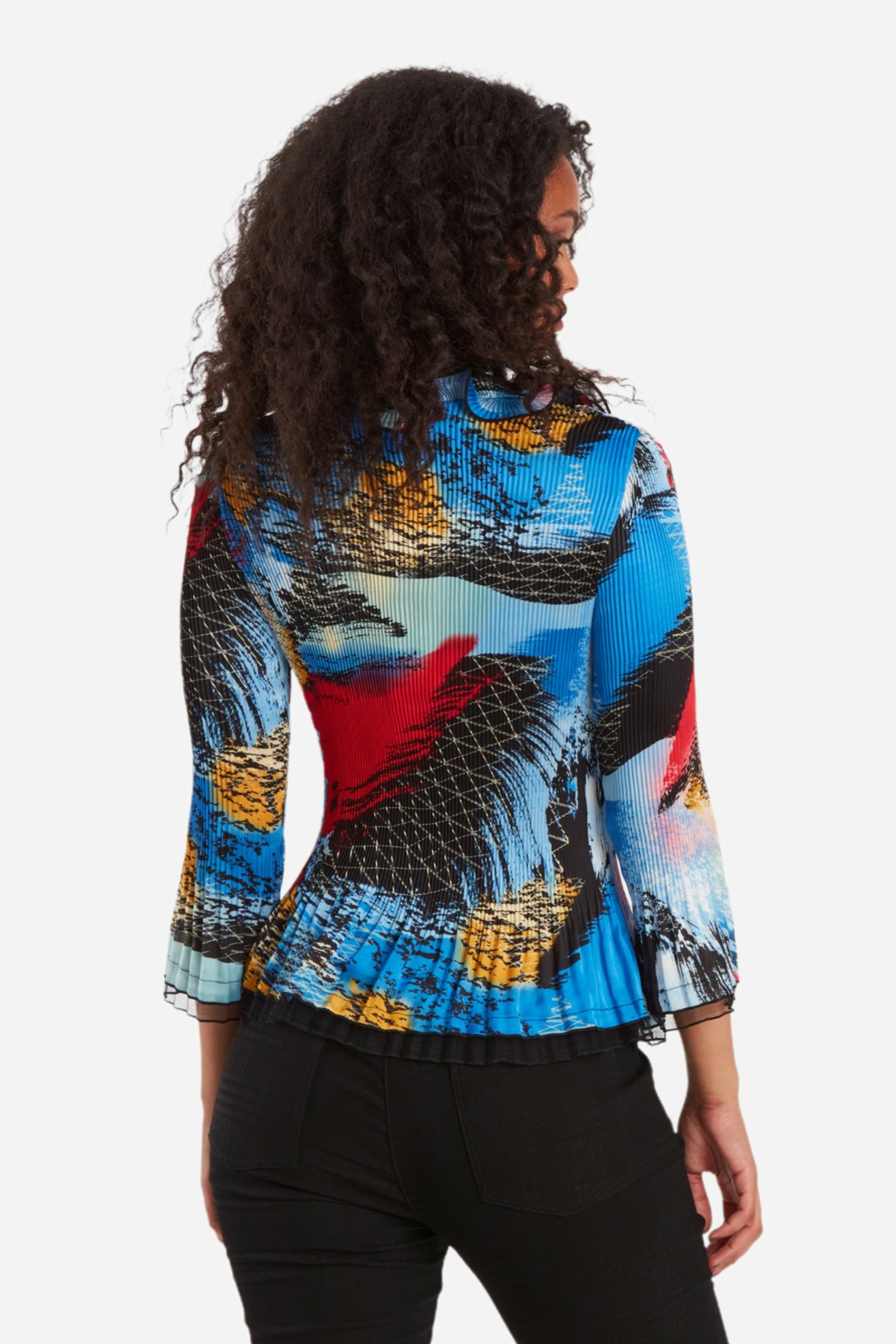 Plisserad blus i chiffongtyg med spännande print samt en svart meshkant i ärmslut och i blusens nederkant. Den V-ringade halsringningen pryds av vackra volanger både i grundprintet och i enfärgad svart mesh. Modellen är något insvängd i midjan och släpper i plisseringen både runt höft, stuss och i nederkanten av den 3/4 långa ärmen. Blusen stängs med små diskreta kulknappar framtill. Den totala längden i storlek S är 62 cm från den högsta punkten under volangen.