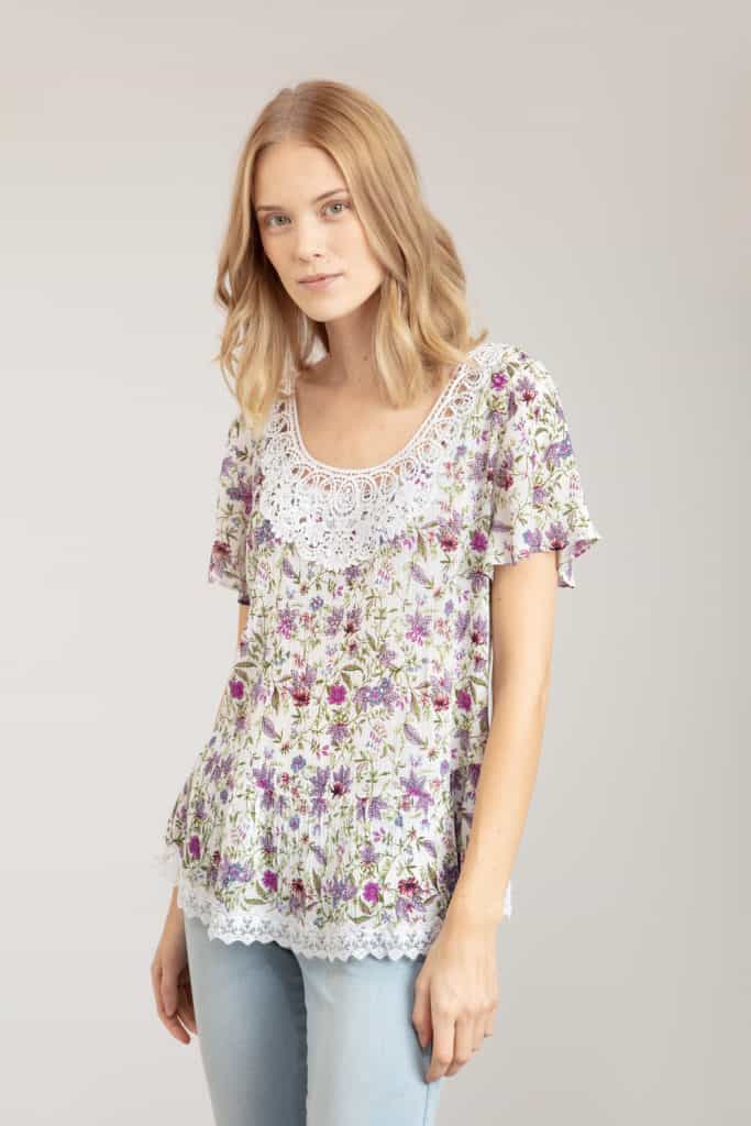 Mönstrad topp i crepe viskos med sött blomprint samt bomullsspets vid halsringningen mitt fram och på volangen vid nederkanten. Kort ärm med vidd och dekorationsstenar i enlighet med mönstret framtill. Den totala längden i storlek S är 83 cm från den högsta punkten.