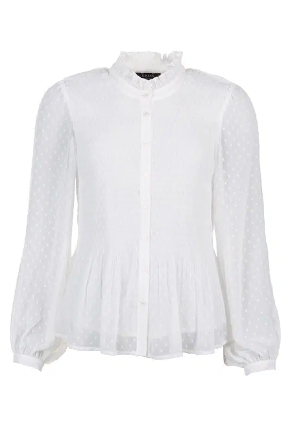 Sober blus i off-white med struktur av vävda prickar ton i ton med bottenfärgen. Tight plissering i livet som sedan släpper runt stuss och höft. Blusen har en ståkrage och en knäppkant med
