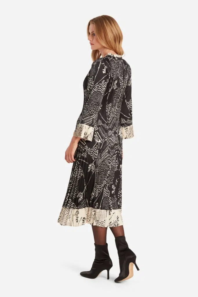 Plisserad blus med ett sobert print i svart och beige. Kragstånd vid halsringningen och en plisserad kant upptill med kontrastfärgat print. Blusen stängs med små knappar framtill och knäppkanten är kantad med en beige paspoal. Modellen är något insvängd i midjan och släpper i plisseringen i nederkant runt höft och stuss. 3/4-lång ärm med en bred plisserad volang i kontrasstfärgat print i avslutet. Längden i storlek S är 63 cm från den högsta punkten under kragen. passar utmärkt ihop med Kjol Miela i samma serie.