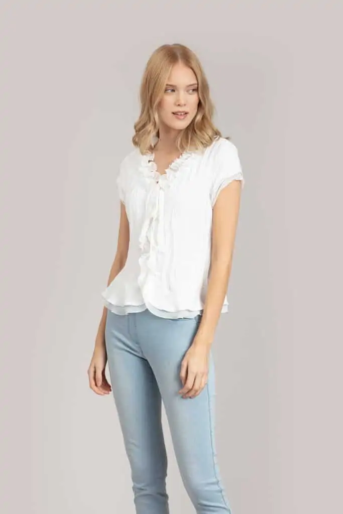Krinklad blus där fuskmocka vackert blandas med chiffong, här i ett vitt utförande. Den V-formade halsringningen pryds av en volang i genombruten chiffong, som också återfinns i blusens nederkant samt vid holkärmen som täcker axeln. Modellen är genomknäppt mitt fram och har två knytfunktioner med olika band. Längden i storlek S är 60cm från högsta punkten.