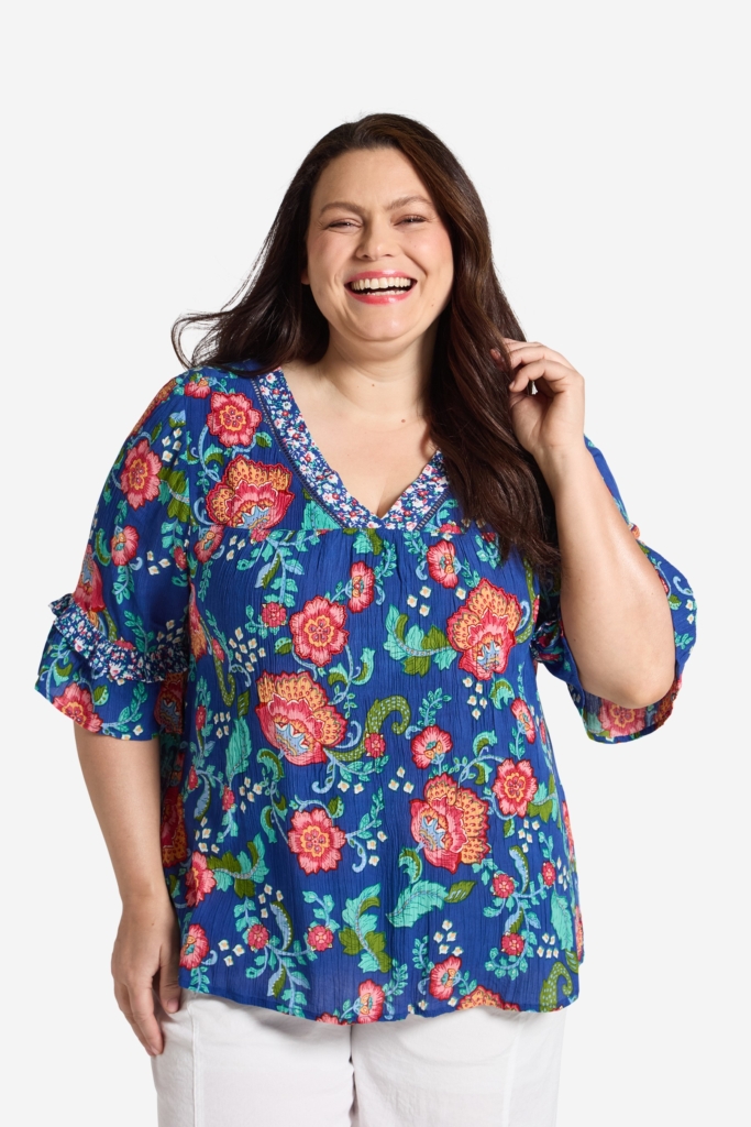 Blommönstrad topp i skön crepe viskos med dekorativ avskärning över byst. V-formad halsringning med en prickig kant, och dekorations stenar i enlighet med mönstret framtill.