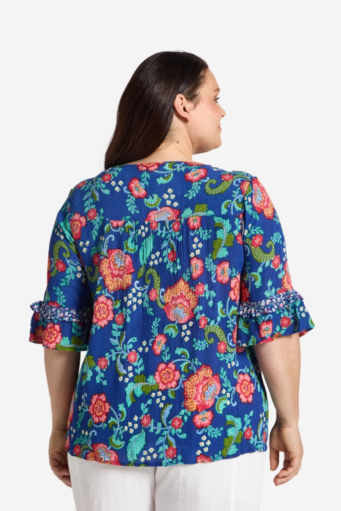Toppen har 3/4-lång ärm med en prickig frill, samt en volang i grundprintet i ärmavslutet och är fodrar vid oket fram och bak. Den totala längden i storlek S är 67 cm från högsta punkten.