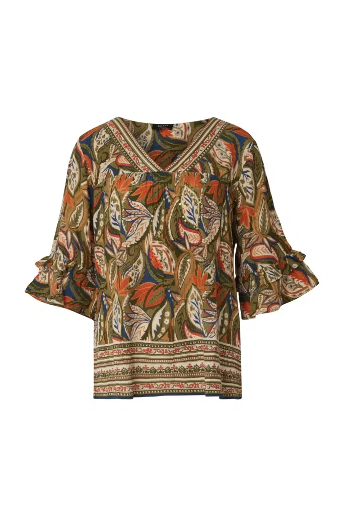 Mönstrad topp i skön crepe viskos med dekorativ avskärning över byst. V-formad halsringning och dekorations stenar i enlighet med mönstret framtill.