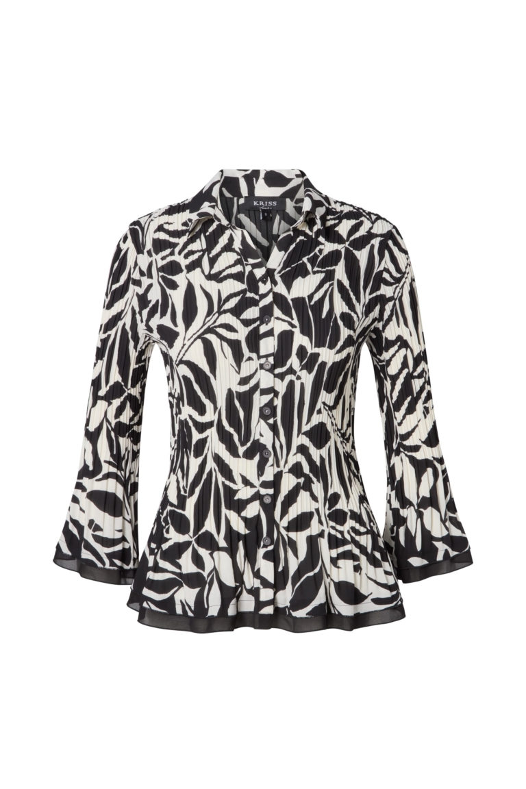 Söt bomullsblus med skir silvertråd i tyget och vackra detaljer. Ok av sydda veck i olika ledder fram och bak. Blusen är rak i passformen och har en mellanlång ärm med bred fåll nertill. Rund halsringning med ett smalt kantband och knäppning mitt fram med knappar i pärlemor. Blusen är något rundad i nederkanten. Den totala längden i storlek S är 65 cm från högsta punkten.