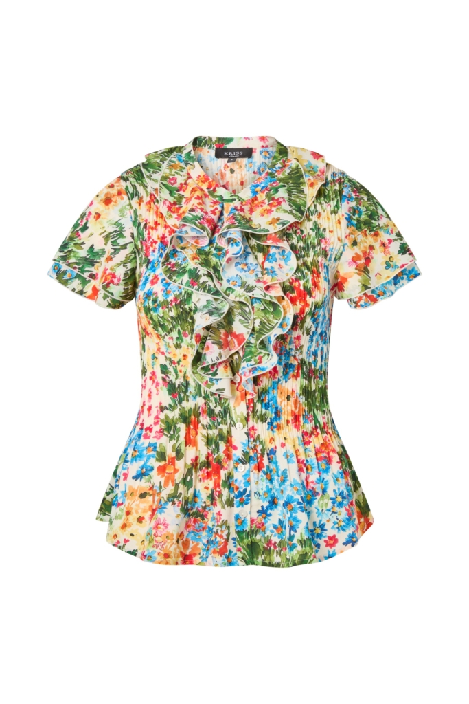 Plisserad blus med blommigt print i glada färger. Låg halskant med dubbla lager volanger framtill som följer knäppkanten en bit ner. Små och diskreta knappar. Plisseringen är tätare runt byst och liv och blir utstruken nertill. Kort holkärm i dubbla lager. Den totala längden i storlek S är 63 cm från den högsta punkten under kragen.