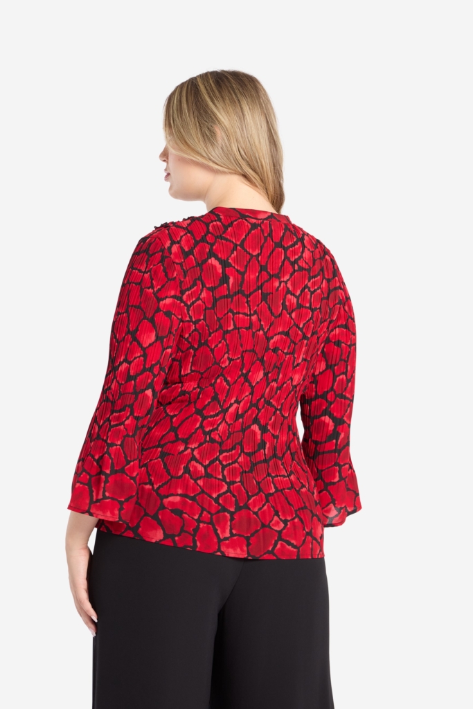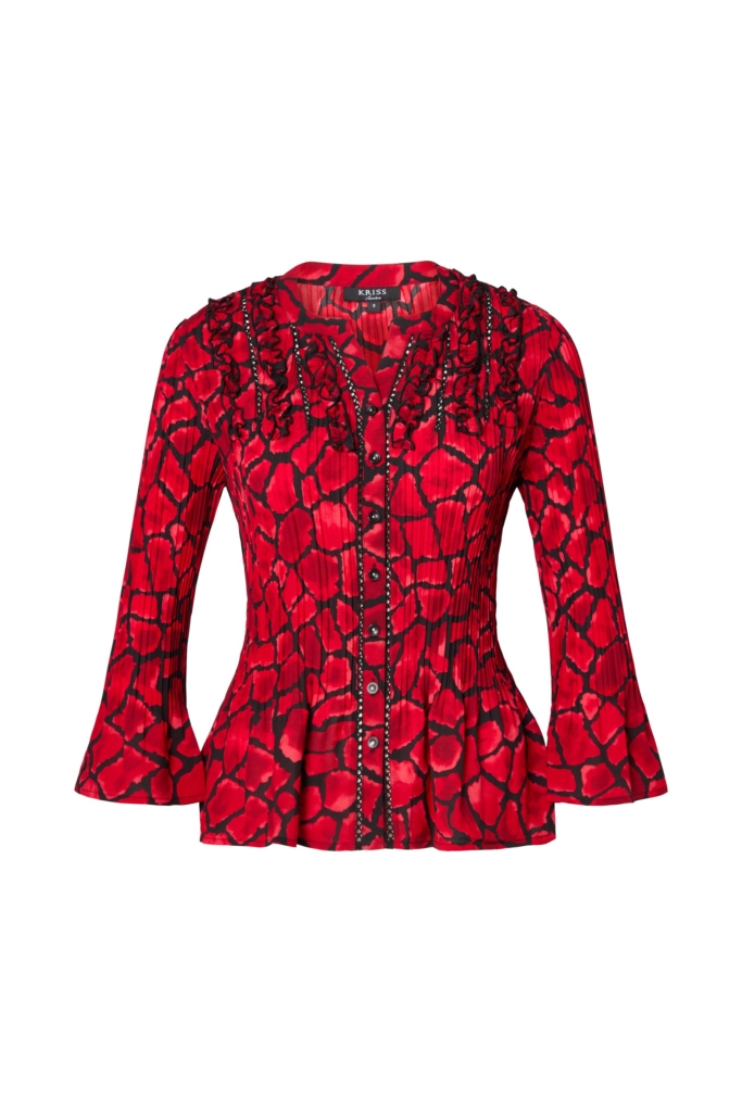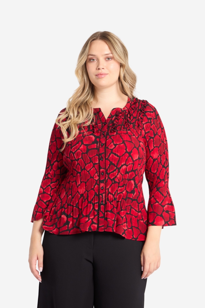 Plisserad blus med tredimensionellt print och svarta spetsdetaljer.