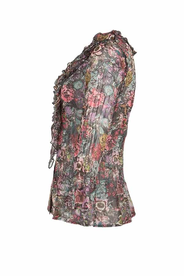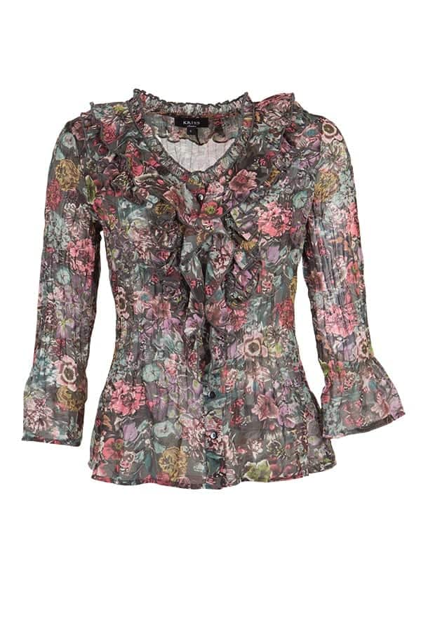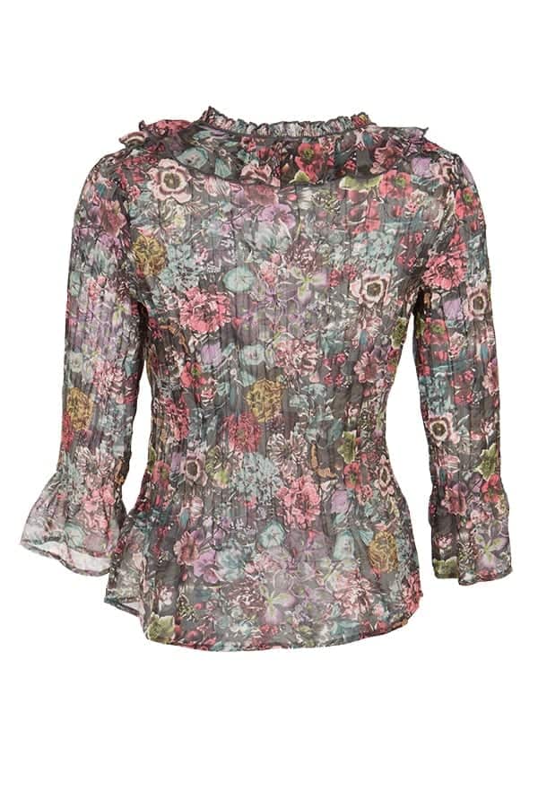 Klassiskt plisserad blus i tufft blommönster i kahki och multifärg. Blusens  v-ringade halslinje pryds av en liten veckad kant med laskade avslut. Från axellinjen och en bit ner längs knappslån böljar en vacker krage i flera olika lager, plisserat, slätt och mesh.   Den hellånga ärmen släpper en aning i plisseringen i ärmslutet på samma sätt som den släpper runt höft och stuss. Blusen är genomknäppt och aningen insvängd i midjan