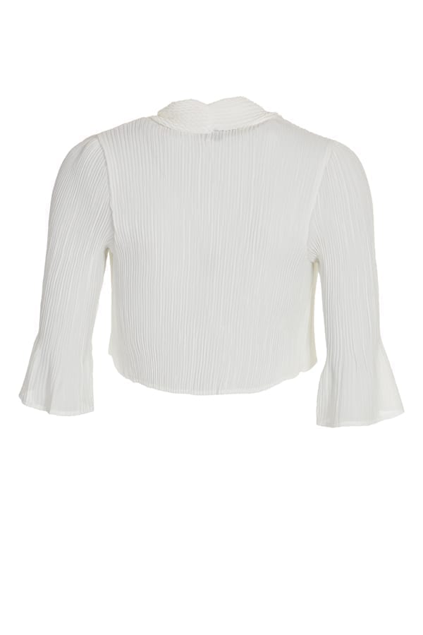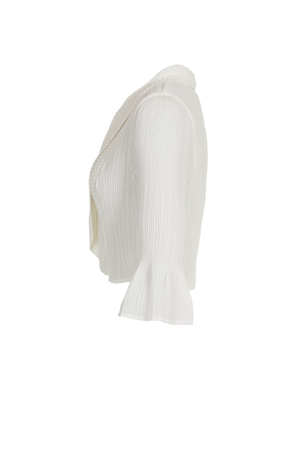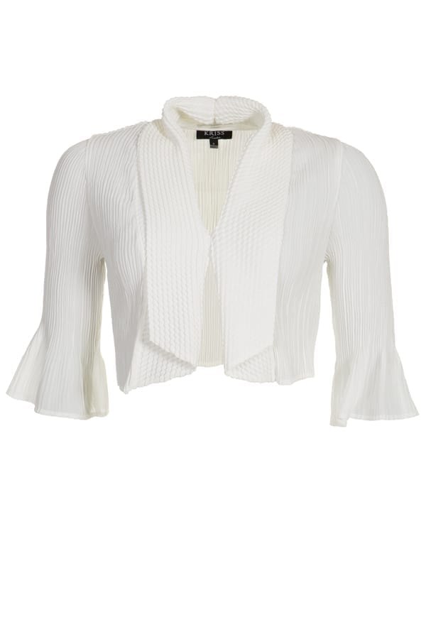 Perfekt bolero, som går till midjan, att ha över klänningen eller toppen. Den är helplisserad med en krage som har en spännande krinkling som bildar ett rutmönster. Trekvartsärmen har en vid avslutning. Finns i cerise, orange och vitt.