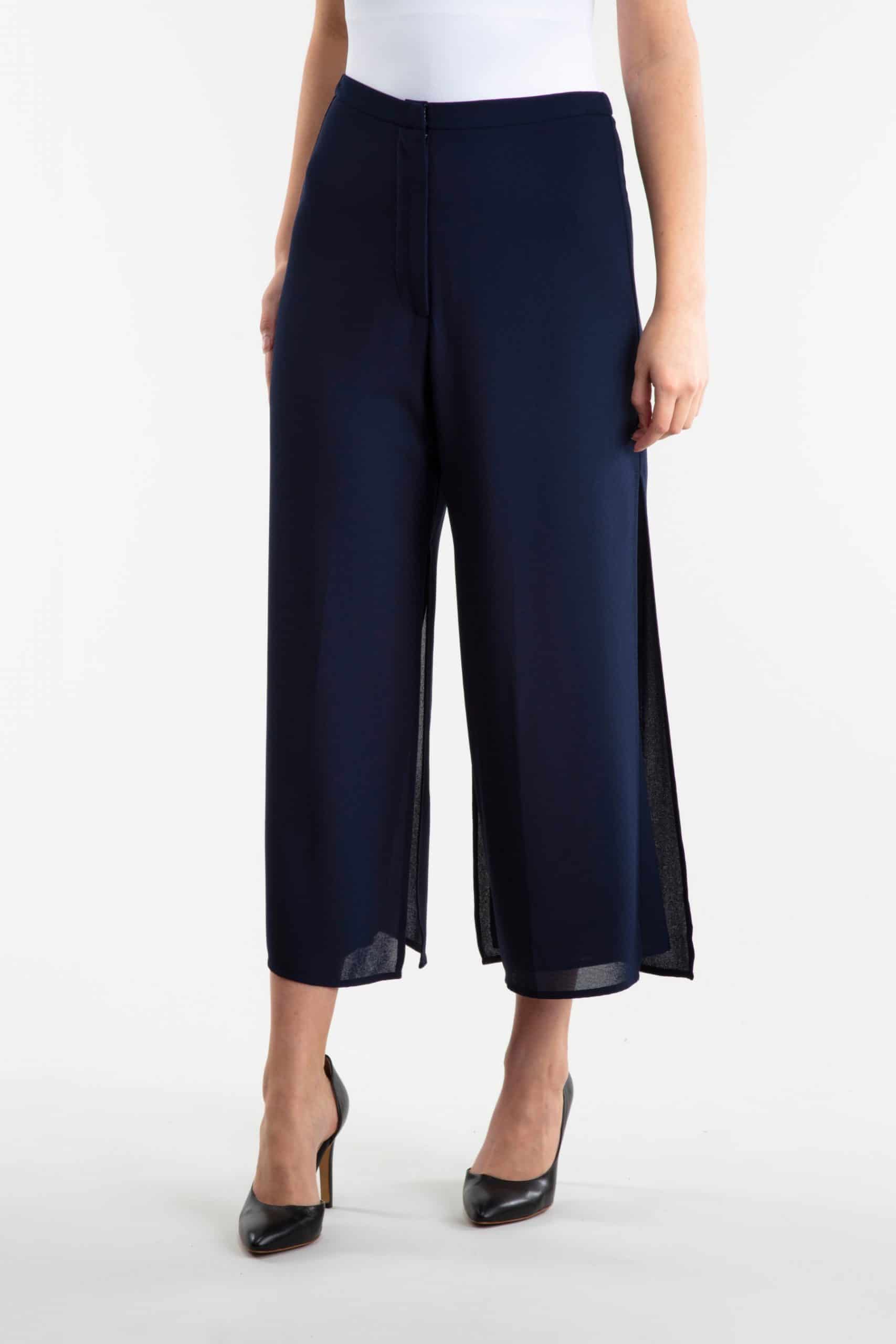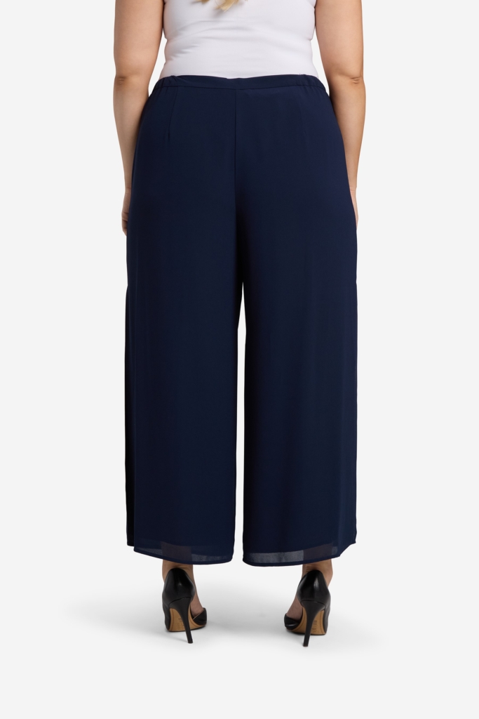 Festlig byxa i 2-lager, här i den ankellånga varianten med vidd nertill. De två lagerna tyg har fördelats dels i en innerbyxa och dels i en ytterbyxa som har hög sidslits. Byxan är högt skuren i midjan och knäpps med dragkedja och hake mitt fram. Längden på insida ben i storlek 36 är 63 cm.