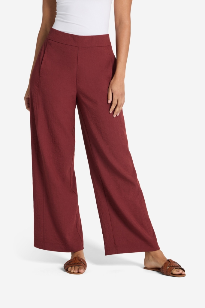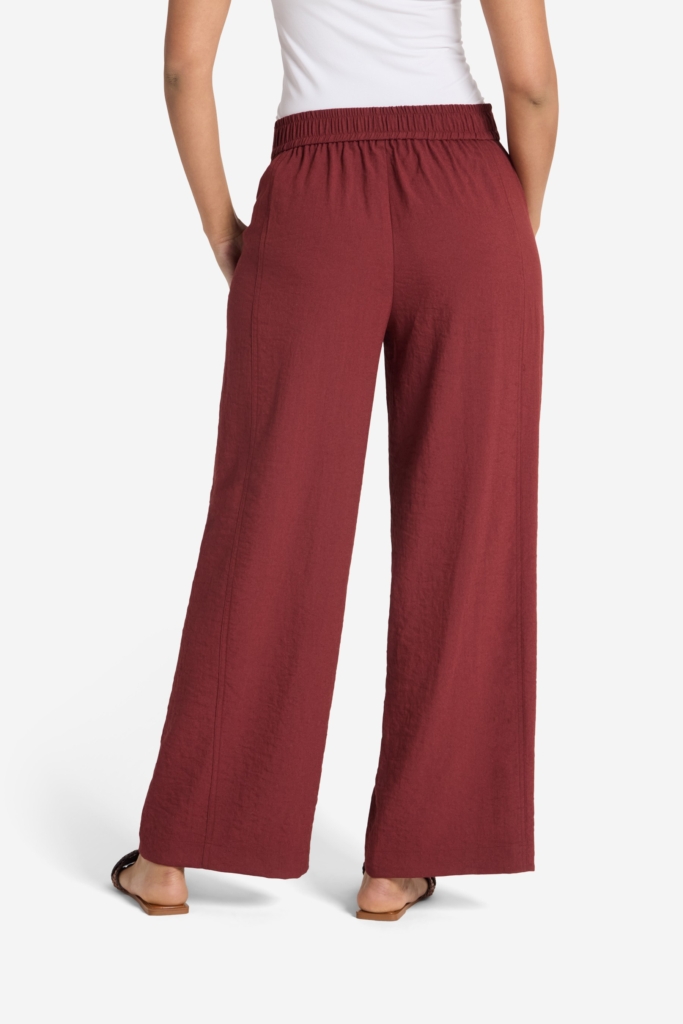 Vid byxa i en viskosblandning med snygg, hamrad struktur i tyget. Brett midjeband framtill och resårband bak. Snedskurna fickor i sidan och markerade sidsömmar som även återfinns baktill på benet. Längden på insida ben är 76 cm. Modellen på bilden är 178 cm lång och bär storlek small.