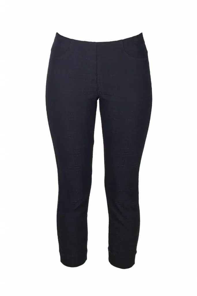 Ankellång byxa med rutig struktur i stretchig kvalitet. Den mjuka, breda resåren i midjan är detaljerad som en vanlig byxa med sömmar som liknar fickor och gylf.