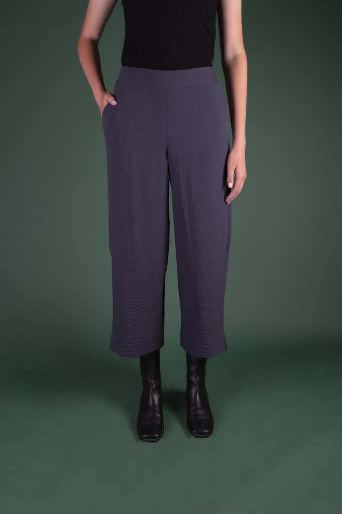 Vid 7/8-dels byxa i crepe-viskos med snygg struktur i tyget. Brett midjeband framtill och resårband bak. Snedskurna fickor i sidan och slitsar vid byxans nederkant. Längden på insida ben är 61,5 cm. Matchar fint med Kavaj Zaga i samma serie.