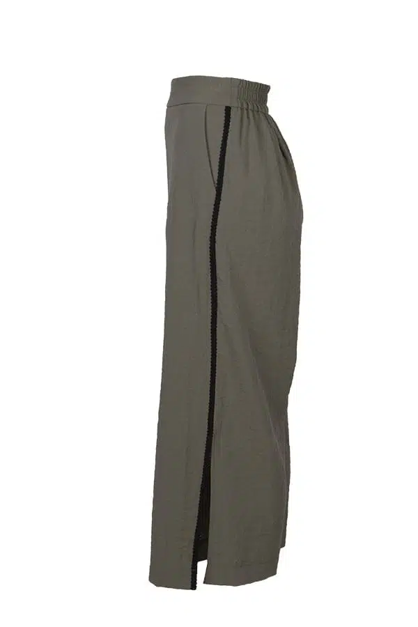 Vid 7/8-dels byxa i crepe-viskos med struktur samt ett svart dekorationsband som revär i sidan. Brett midjeband framtill och resårband bak. Fickor i sidan och höga slitsar vid byxans nederkant. Matchar fint med Kimono Zarah i samma serie.