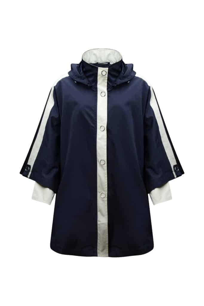 Cape i generös modell med kontrastfärgade detaljer i en skön och glatt kvalitet. Ståkrage med kontrastfärg på insidan och avtagbar kapuschong med dragsko, snoddar och metall stoppers. Ärmen har ett kontrastfärgat band samt en slejf med öljett på ovansidan, och sitter ihop med capen. Den nedre delen av ärmen kommer ut under capen, och sitter ihop med fodret, även dessa i motsatt färg. Modellen är genomknäppt med stora tryckknappar med öljetter i matt silver samt en dragkedja under knäppkanten i kontrastfärg. Snedskuren ficka med ficklock fram, och baktill finns ett kontrastfärgat band i mittsömmen. Den totala längden i storlek S/M är 89 cm från den högsta punkten under kragen.