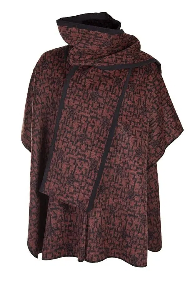 Snygg cape med höstligt mönster i färgerna rost/svart. Öppen sida med en ihopsydd punkt en bit under ärm. Avtagbar scarf med svarta kanter och baksida, som fästs fast med en tryckknapp baktill. Rund halsringning med sprund ned till det dekorativa spännet mitt fram.