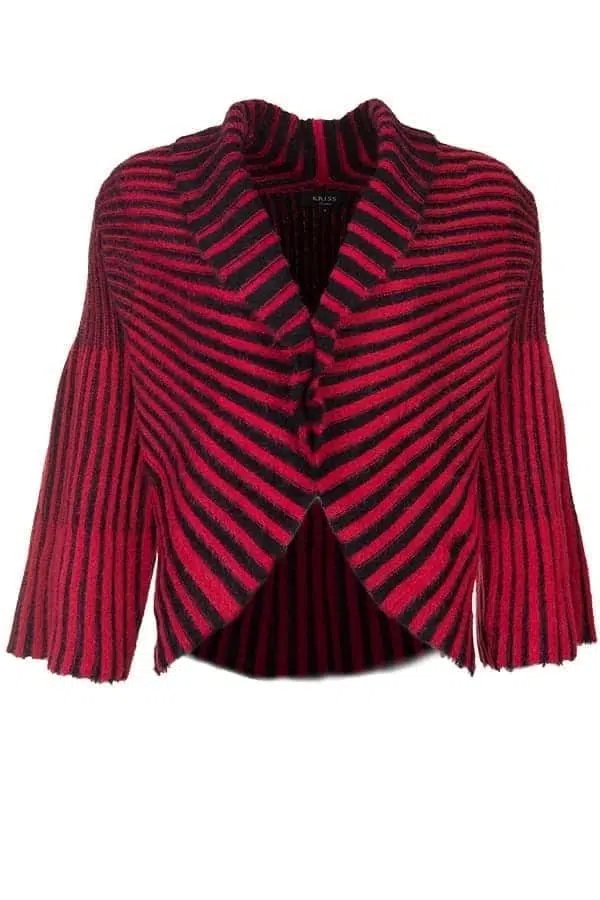 A-linjeformad öppen cardigan med ett brett kavajslag som ger ett välklätt intryck. Svart bas med röda ränder i varierande bredder skapar olika fält. Ränderna formar midja, slankar och förlänger. Hellång ärm med vid nederkant.