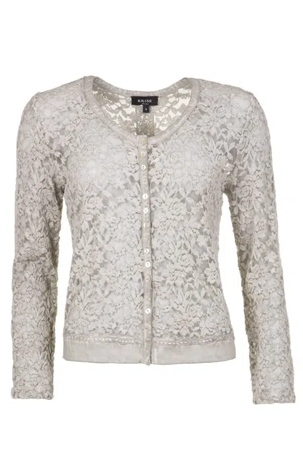 Denna underbara cardigan i spets har ett diskret blommönster kombinerat med enkla småmaskiga nätpartier. Den djupa något rundade halsringningen har kantats med ett tyg som är färgats i in i matchande nyanser. Längst ner runt höften finns även detta läckra tyg och spetsen löper vackert utanpå och bildar en liten vågformad bård. De hellånga ärmarna avslutas med et enkelt uppvik. De små pärlemoknapparna som är grupperade tre och tre på den kantade knappslån.