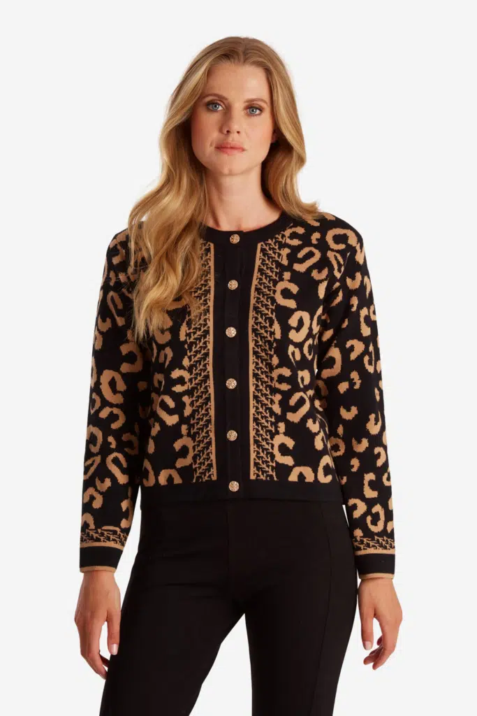 Slätstickad cardigan i tufft utförande med leopardmönster och diagonala ränder. Modellen är rak och något insvängd i midjan och den har ett svart enfärgat kantband vid den runda halsringningen. Kanten fortsätter som knäppkant och vidare ner runt nederkanten, och återfinns även vid ärmslutet av den långa ärmen. Stängning med dekorativa knappar mitt fram. Koftan är ofodrad och har lång ärm. Den totala längden i storlek S är 55,5 cm från den högsta punkten.
