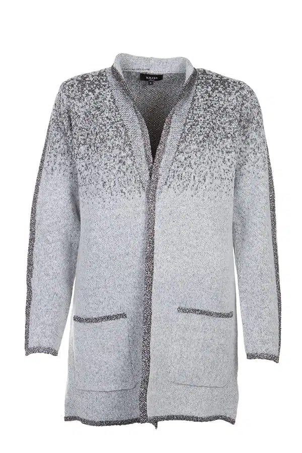 Stickad cardigan med glittriga detaljer i form av kantband, revär på ärmen och över axelpartiet fram och bak. Liten ståkrage som går att vika ner samt två fickor fram.