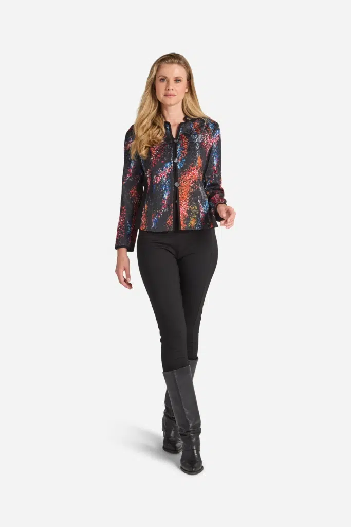 Kavajjacka med guldskimrande jaquard mönster i multifärg och svarta detaljer. Jackan är fodrad, något insvängd i midjan och har slitsar nedtill. Svart kontrasttyg i sidan och under ärm som ger ett slankande intryck. Rund halsringning med ståkrage och svart kantband, svart knäppkant med dekorativa knappar mitt fram samt svart kantband i nederkant av den långa ärmen. Den totala längden i storlek 36 är 59,5 cm från den högsta punkten under kragen. Modellen på bilden är 178 cm lång.