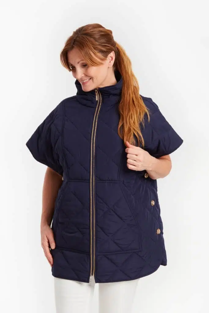 Fodrad cepejacka i generös modell med quiltat tyg och hög ståkrage som med fördel kan vikas ut. Blixtlås fram med guldpaspoal intill, guldfärgade knappar i sidorna samt rundad nederkant. Nedsjunken axel med ett påsytt band från halssömmen ner till ärmslutet på den halvlånga ärmen. Dekorativa sömmar bildar ett frackok över bysten samt kängurufickor på vardera sida om blixtlåset. Längden i storlek S/M är 81 cm från den högsta punkten under kragen.