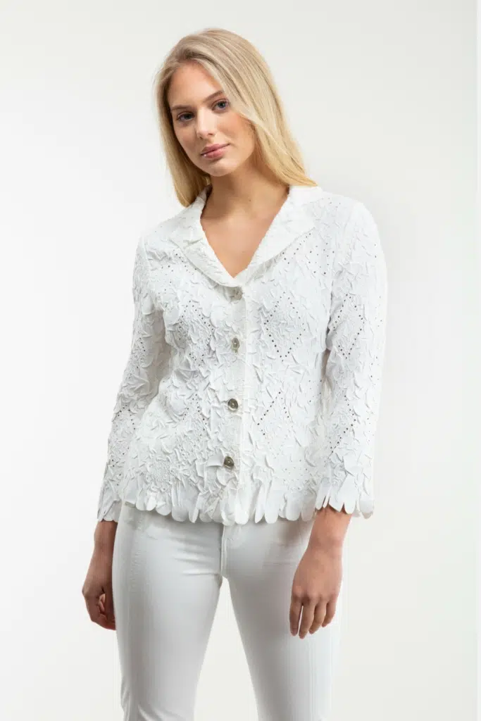 Kavajinspirerad jacka i fuskmocka med unik design. Spännande struktur med ett hålmönster i tyget som ger plagget en exklusiv känsla. Runt den V-formade halsen sitter en kavajkrage med slag. Modellen är något figursydd och den knäpps med diskreta pärlemorskimrande knappar mitt fram. Trekvartsärm med ett dekorativt avslut, samma avslut som finns runt höften i nederkanten på jackan.