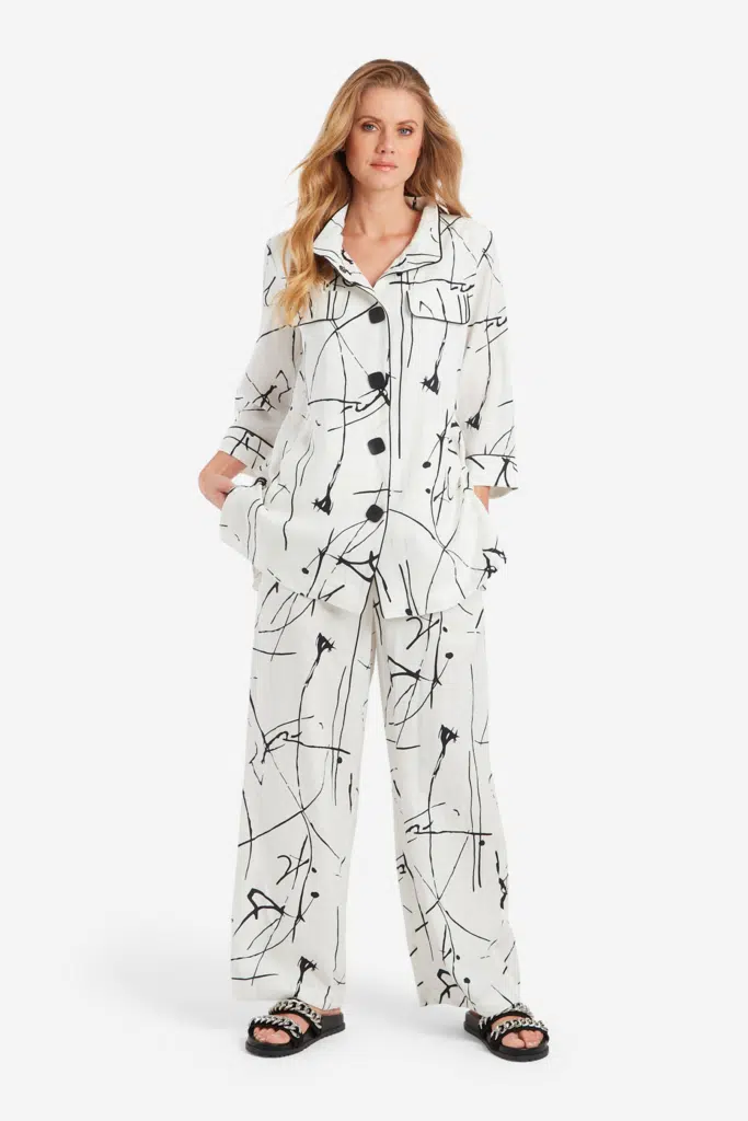 Kavaj/jacka med struktur i somrig kvalitet med linne. Modellen har en bred ståkrage med svart paspoal i kanten som fortsätter längst med framkanterna. Jackan öppnas och stängs mitt fram med stora tryckknappar som har svarta, fyrkantsformade knappar på ovansidan. Jackan har rak passform med slitsar nedtill, fuskfickor vid bysten med lock och svarta paspoaler runt om samt dolda fickor i prinsessömmarna mot sidan. 3/4-lång, vid ärm med ett uppvik och svart paspoal nedtill. Den totala längden i storlek S är 78 cm från den högsta punkten under kragen. Matchar fint med Byxa Kieu i samma serie.