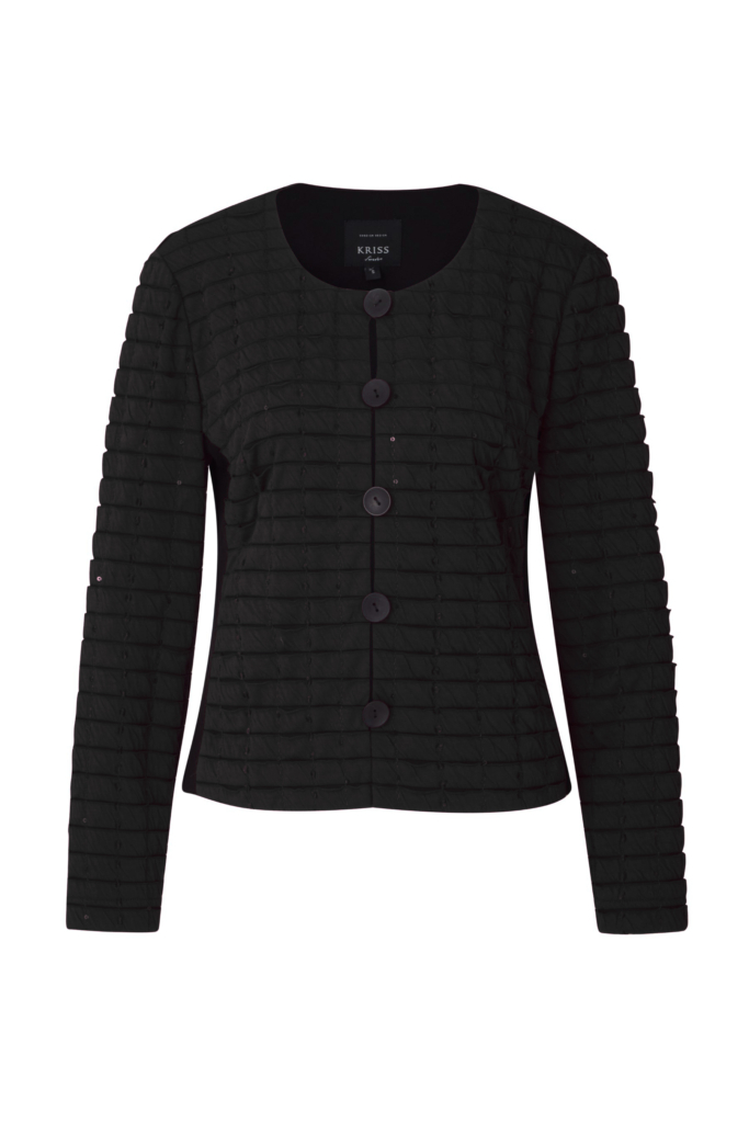 Lättburen jacka med struktur i en bubblig trikå som är mjuk och följsam. Passform med något insvängd midja, lång ärm samt släta sidopartier i svart. Jackan är fodrad fram- och baktill, och den har en rund halsringning. Knäppning mitt fram med fem dekorativa knappar samt öglor på motsatt sida. Den totala längden i storlek S är 57cm från högsta punkten.