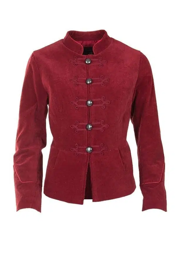 Snygg sammetsjacka i en mjuk bomullskvalitet med bandagraffer fram vid knäppning och på ärm. Jackan är figursydd och har ståkrage samt mycket dekorativa knappar med knapphällor. Den är fodrad och har lång ärm, och kan matchas med byxan i samma roströda färg och kvalitet.