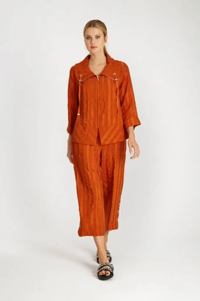 Kavaj/ jacka i somrig kvalitet av smidig strukturväv med viss glans och skönt fall. Strukturen är bubblig varvat med vävda ränder som liknar en stor bäck- och bölja kvalitet. Modellen har en bred krage som viker ut sig som ett slag med bomullsband och öljetter i ändarna. Dessa band kan forma kragen efter tycke och smak. Jackan öppnas och stängs mitt fram med ett dolt blixtlås i silver som går upp i kragen, och den har rak passform med en bred bård nertill. Dolda fickor i prinsessömmarna mot sidan. 3/4-lång, vid ärm med ett uppvik nedtill. Den totala längden i storlek S är 62 cm från den högsta punkten under kragen. Matchar fint med Byxa Mondi i samma serie.