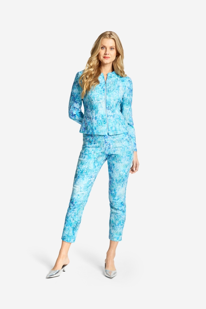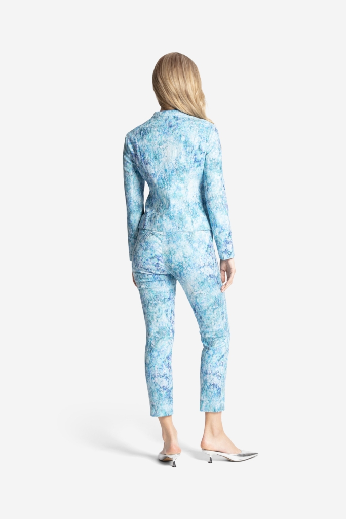 En stretchig jacka med småmönstrat print och broderier i tyget. Jackan är fodrad, något insvängd i midjan och stängs med ett blixtlås mitt fram. Den har en liten ståkrage runt den runda halsringningen och en smal paspoal i kanten som även fortsätter ner bredvid blixtlåset. Jackan har lång ärm och en slits nedtill, och den totala längden i storlek S är 58 cm från den högsta punkten under kragen. Modellen på bilden är 178 cm lång och bär storlek small. Våra större storlekar är normala i storleken, medan våra mindre storlekar är något mer generösa.