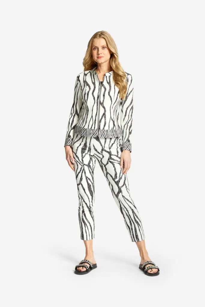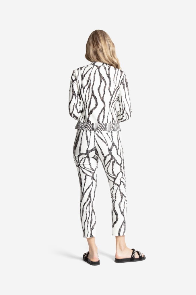 En stretchig jacka med tufft print i vitt och svart samt broderier i tyget. Jackan är fodrad, något insvängd i midjan och stängs med ett blixtlås mitt fram. Den har en liten ståkrage runt den runda halsringningen och en smal svart paspoal i kanten som även fortsätter ner bredvid blixtlåset. Jackan har lång ärm och en slits nedtill, och avslutas med en småmönstrad bård. Den totala längden i storlek S är 58 cm från den högsta punkten under kragen. Våra större storlekar är normala i storleken, medan våra mindre storlekar är något mer generösa.