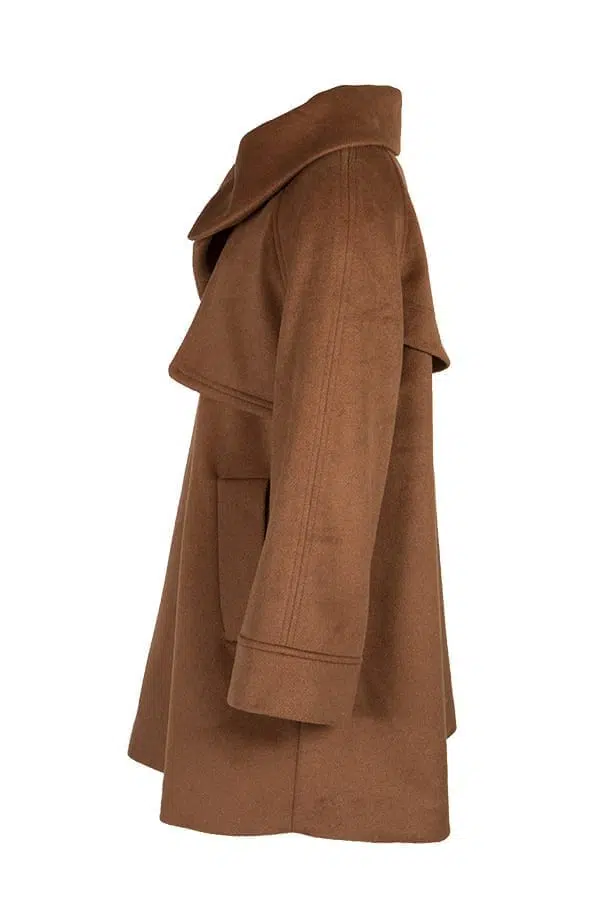 Stilren kappa med detaljer i en mjuk och skön ull blandning. A-linjeformad modell med trench liknande ok-detalj på ena sidan fram, samt på bakstycket, där det även finns ett motveck. Kappan har en stor, oliksidig krage och knäpps med knappar på insidan av plagget. Vid raglanärm med bred fåll nedtill. Markerade fickor fram med dubbelvikt öppning. Kappan är helfordrad och den totala längden i storlek S är 83 cm från den högsta punkten mitt bak, under kragen.