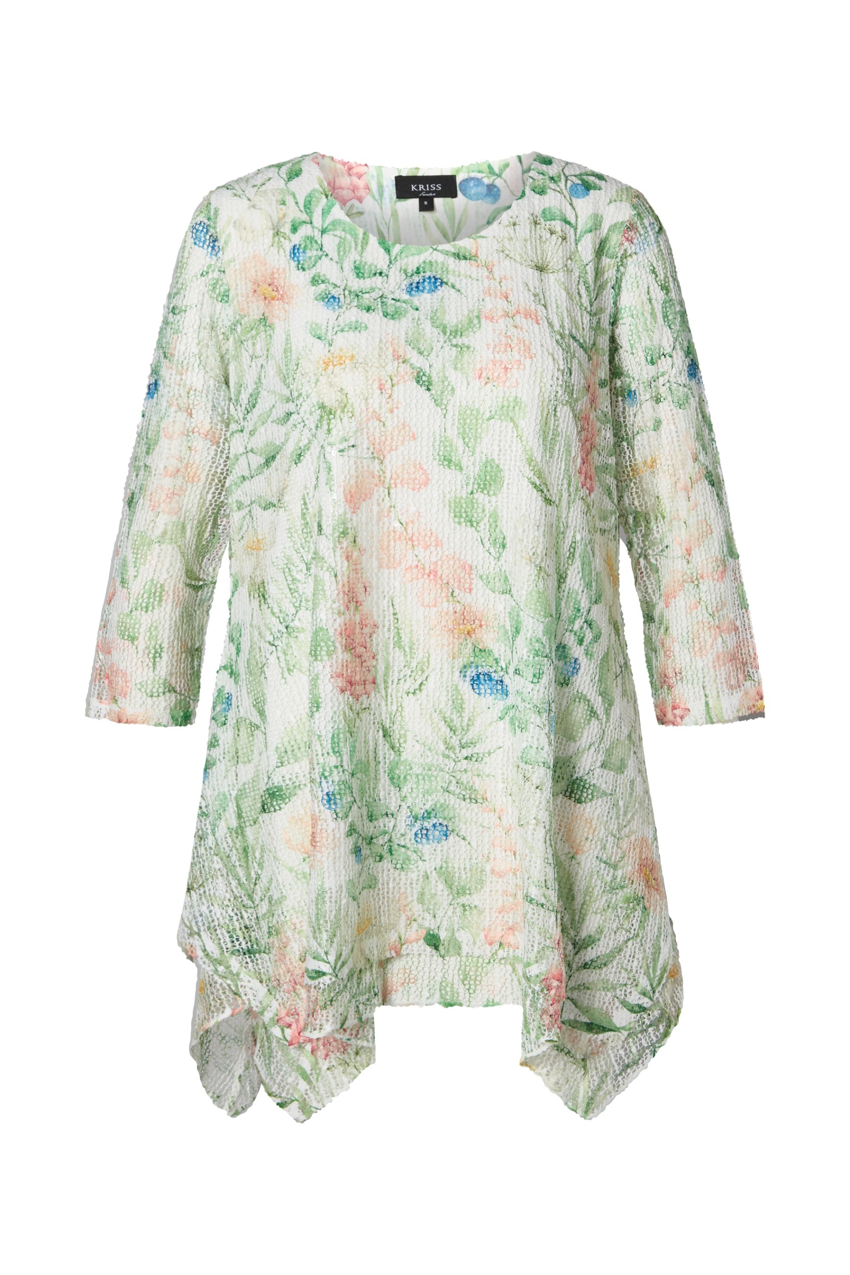Krinklad kavaj i vårliga färger och abstrakt print på en blank botten. Modellen är något kortare och har en krage med slag samt hellång ärm. Den har två fickor framtill och knäpps mitt fram med knappar av pärlemor. Längden i storlek S är 58 cm från högsta punkten under kragen. Modellen på bilden är 178 cm lång och bär storlek small. Våra större storlekar är normala i storleken, medan våra mindre storlekar är något mer generösa.