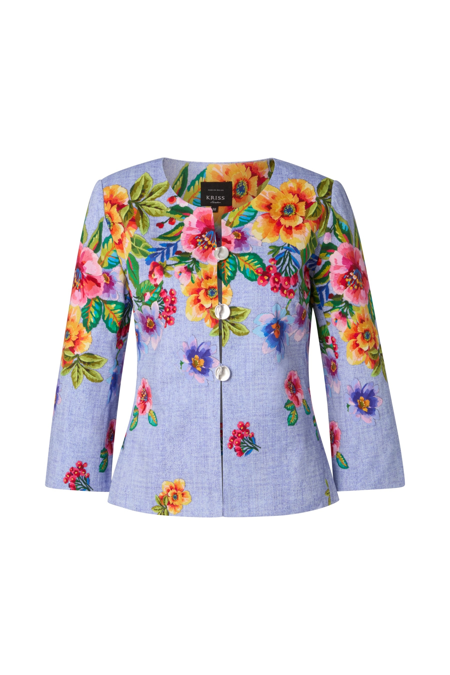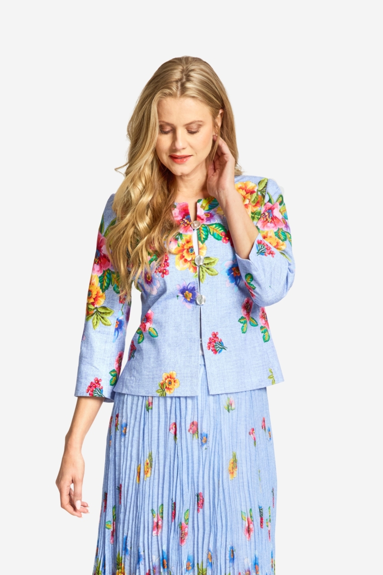 Fodrad kavaj med lång ärm i broderat tyg med hålmönster. Krage och slag vid framkanten upptill och figursydd passform med bystinsnitt. Jackan stängs med en knapp mitt fram och den har fickor framtill med paspoal vid öppningen. Den totala längden i storlek S är 60 cm från den högsta punkten under kragen.