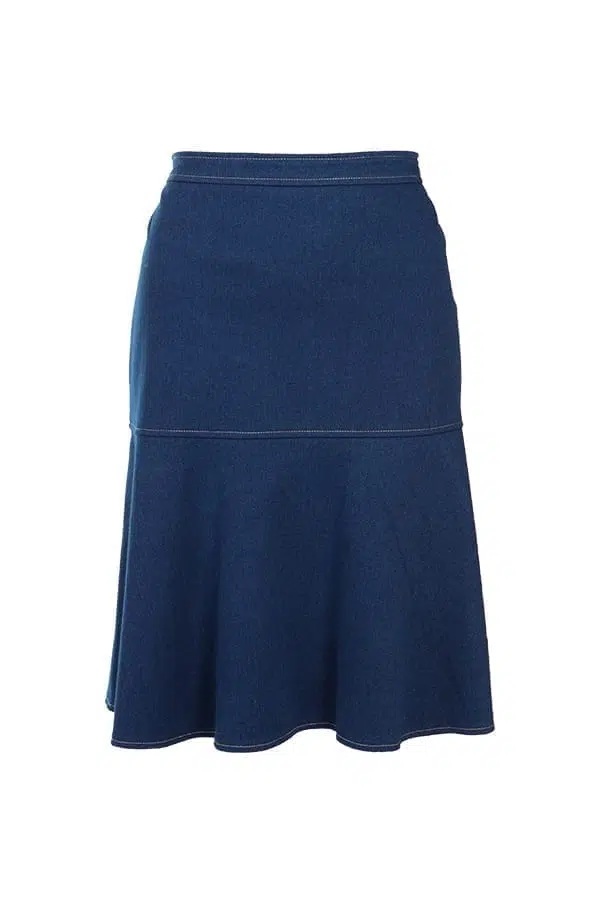 Jättemjuk och stretchig denimkjol med foder. Snygg avskärning med dekorativ söm 30 cm ned från midjelinningen och klockad nederdel av kjolen. Blixtlås mitt bak. Kjolens totallängd är 60 cm i storlek S.